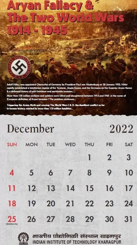 'हिंदुत्व' शब्द इस साल के आखिरी महीने में लगातार सुर्खियां बटोर रहा है। कभी धर्म संसद के नाम पर तो कभी नफरती भाषण और शपथ ग्रहण कार्यक्रमों के चलते, इसकी जगह-जगह आलोचना भी हो रही है। अब इसी बीच खबर है कि पश्चिम बंगाल स्थित देश के सबसे पुराने भारतीय तकनीकी संस्थान यानी आईआईटी खड़गपुर भी इसके चलते विवादों में आ गया है। संस्थान की ओर से तैयार एक कैलेंडर पर हिंदुत्व के प्रचार-प्रसार की कोशिश में इतिहास को विकृत करने का आरोप लग रहा है। जहां संस्थान और इस कैलेंडर को तैयार करने वाले इसमें कुछ भी गलत नहीं होने का दावा कर रहे हैं। वहीं दूसरी ओर कई शिक्षाविद् और संस्थान के पूर्व छात्र इसके खिलाफ मोर्चा खोले हुए हैं।