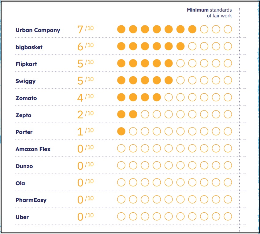 रिपोर्ट बताती है कि बिगबास्केट, फ्लिपकार्ट और अर्बन कंपनी के अलावा कोई अन्य प्लेटफ़ॉर्म ऐसी प्रतिबद्धता या समुचित प्रमाण प्रदान नहीं करते जिनसे कर्मचारियों की आमदनी उनके द्वारा किये गए काम के घंटो से अनुरूप उनके लिए न्यूनतम मज़दूरी सुनिश्चित करते हों।