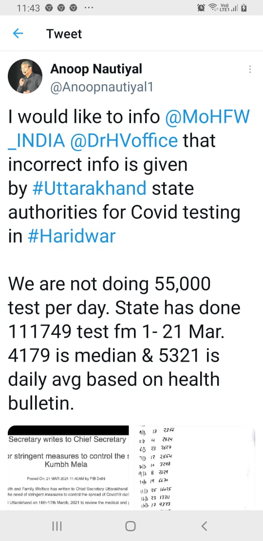 कोरोना के डाटा का विश्लेषण कर रही देहरादून की संस्था सोशल डेवलपमेंट फॉर कम्यूनिटीज़ फाउंडेशन के अनूप नौटियाल कहते हैं कि कोविड टेस्टिंग को लेकर उत्तराखंड सरकार ने केंद्र को गलत डाटा मुहैया कराया है। हरिद्वार में 55,000 टेस्ट हर रोज़ नहीं हो रहे हैं। 1-21 मार्च के भीतर हरिद्वार में 1,11,749 टेस्ट नतीजे आए हैं। यानी औसतन 5,321 टेस्ट हर रोज़। ये विश्लेषण उत्तराखंड सरकार द्वारा जारी हेल्थ बुलेटिन के आधार पर किया गया है।