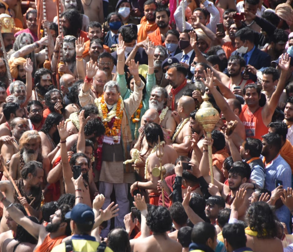 मुख्यमंत्री तीरथ सिंह रावत भी इस अवसर पर हरिद्वार पहुंचे और साधु-संतों का आशीर्वाद लिया। साधु-संतों की रैलियों में सोशल-डिस्टेन्सिंग कहीं नहीं थी। चेहरों पर मास्क नहीं थे। साधुओं के बीच मौजूद मुख्यमंत्री स्वयं बिना मास्क और बिना सोशल डिस्टेन्सिंग के नज़र आते हैं।