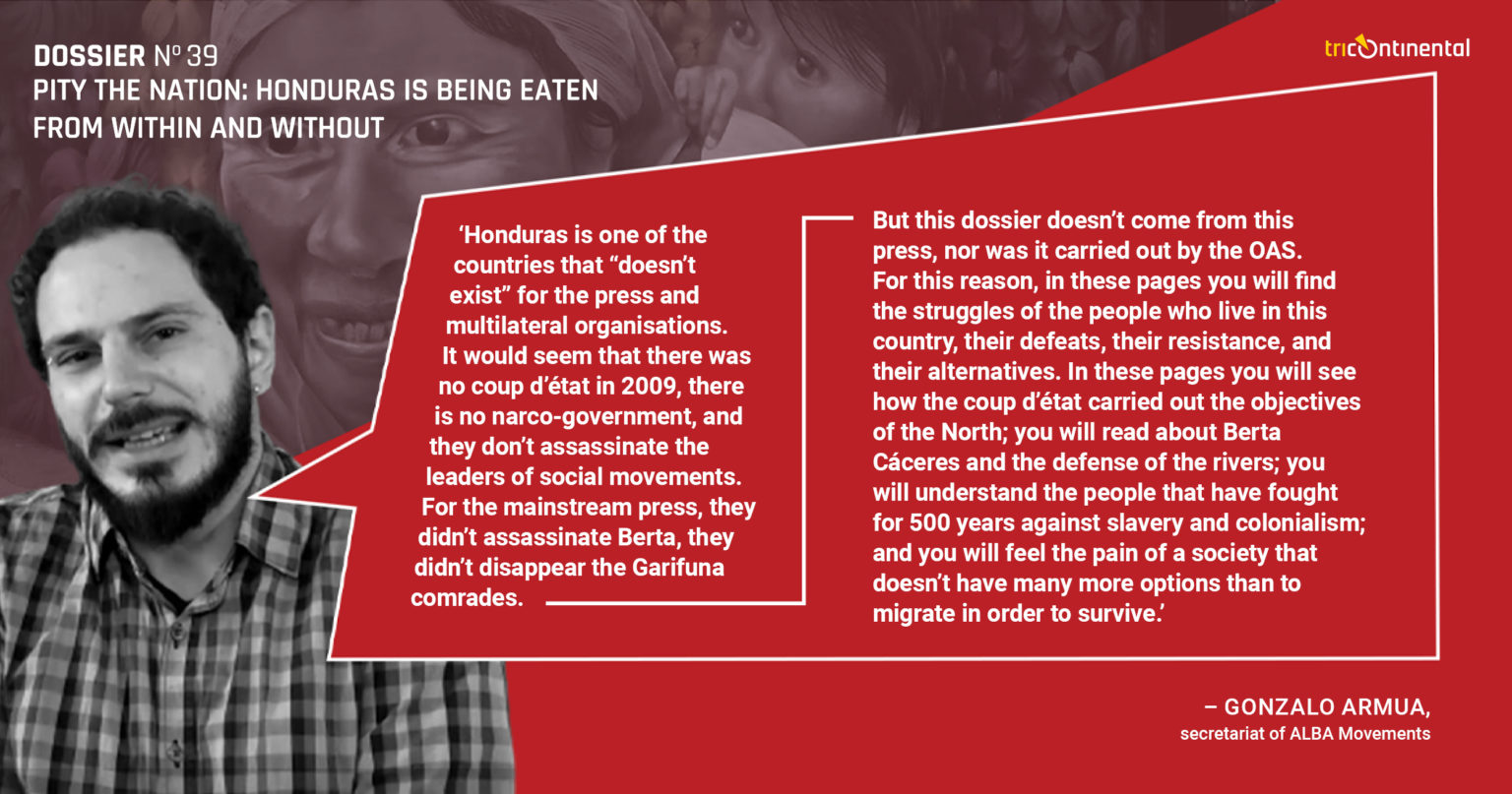 इस हफ़्ते, ट्राईकॉन्टिनेंटल: सामाजिक शोध संस्थान ने 2009 के तख़्तापलट और जेओएच के शासनकाल पर एक डोज़ियर प्रकाशित किया है। इस डोज़ियर में हमने उन प्रक्रियाओं पर रौशनी डालने की कोशिश की है जिनसे अटाला ज़बल्ला जैसे अभिजात्य वर्ग को होंडुरस में लोगों की गरिमा और ज़मीन की रक्षा करने वाले बेर्ता कासेरेस और कार्लोस सेरोस जैसे बहादुर नेताओं के ख़िलाफ़ हिंसा करने का खुला माहौल मिलता है। हम सीओपीएनएच और पीपुल्स डिस्पैच (और ख़ास तौर पर ज़ो एलेक्जेंड्रा) को इस डोज़ियर के लिए रीसर्च करने और इसे लिखने के लिए धन्यवाद देते हैं। डोज़ियर, लज्जित राष्ट्र: होंडुरास को भीतर और बाहर से नष्ट किया जा रहा है, तीन भागों में बँटा है: