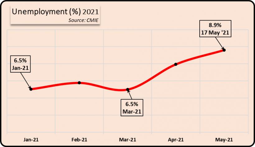 दूसरी ओर, बेरोजगारी की दर में वृद्धि महामारी के बढ़ते प्रभाव को दर्शाती है, मृत्यु और संक्रमण के बढ़ते मामलों से उत्पन्न तबाही, और फिर सरकारों द्वारा घोषित राज्य-वार या क्षेत्रीय लॉकडाउन इसके बड़े जिम्मेदार हैं। वर्तमान में, कम से कम 26 राज्यों में अलग-अलग प्रकार के लॉकडाउन लगे हुए हैं। इसका सीधा प्रभाव आजीविका पर पड़ता है, क्योंकि बड़ी संख्या में लोग अनौपचारिक व्यवसायों में काम कर रहे होते हैं, जहां ऐसी परिस्थितियों में काम बंद हो जाता हैं।