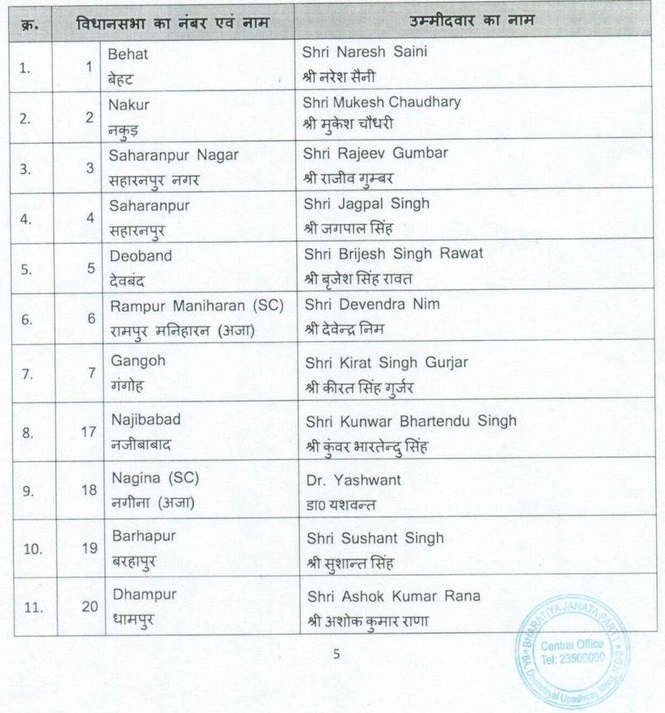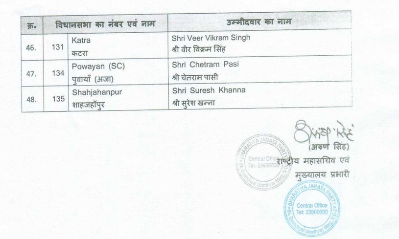 पहले और दूसरे चरण के चुनावों के लिए लिस्ट जारी करते हुए भारतीय जनता पार्टी के यूपी प्रभारी ने बताया कि मुख्यमंत्री योगी आदित्यनाथ अपने गृह क्षेत्र गोरखपुर शहर से ही चुनावी मैदान में उतरेंगे जबकि उप मुख्यमंत्री केशव प्रसाद मौर्य को प्रयागराज सिराथू सीट से टिकट दिया गया है। इसके अलावा योगी सरकार में ऊर्जा मंत्री श्रीकांत शर्मा को मथुरा विधानसभा के लिए मैदान में उतारा गया है, जबकि कैराना से मृगांका सिंह और थाना भवन से सुरेश राणा को टिकट मिला है। पार्टी ने हस्तिनापुर की सीट पर दिनेश खटीक पर विश्वास जताया है, जबकि रक्षा मंत्री राजनाथ सिंह के बेटे पंकज सिंह को फिर से नोएडा से उम्मीदवार बनाया गया है।