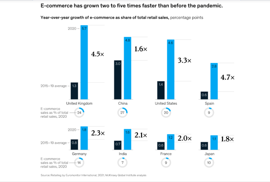 खुदरा व्यापार (retail business) में ई-कॉमर्स उन कुछ क्षेत्रों में से एक है, जहां महामारी के दौरान विकास में नाटकीय वृद्धि देखी गई। कुल खुदरा बिक्री में ई-कॉमर्स की हिस्सेदारी कुछ प्रमुख अर्थव्यवस्थाओं में लगभग 5 गुना बढ़ गई है।